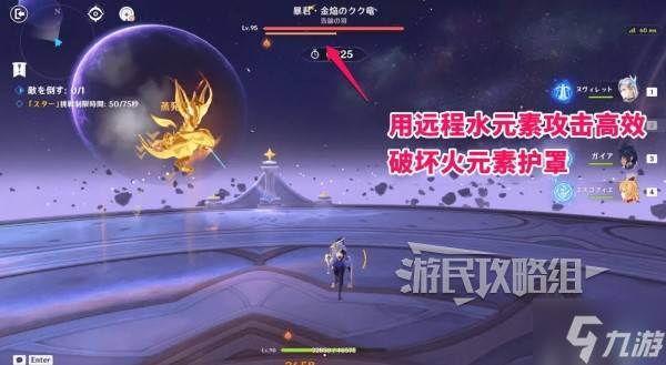 出现金焰护罩期间BOSS本体不会受到伤害,需要通过水元素攻击迅速破坏护罩(其他非火焰元素也能造成少量伤害),护罩破坏后BOSS会倒地,集火输出即可。