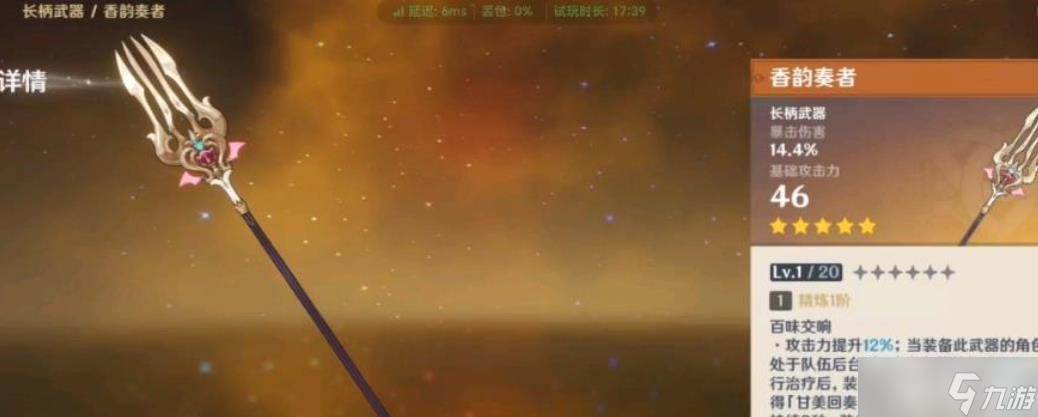 香韵奏者是爱可菲五星专属武器,精炼一阶满级基础攻击率为六百零八,暴伤为百分之六十多,同模的武器有柔灯挽歌和护摩之杖,这把武器是首个五星泛用性长柄辅助武器,适合长枪治疗角色携带的攻击拐,游戏中有不少以攻击为模组的输出或者副C角色。香韵奏者的特效是提供百分之十二攻击力,角色挂后台时攻击力再加百分之十二,提供治疗后奶妈和奶妈辅助的角色都加百分之三十二攻击。