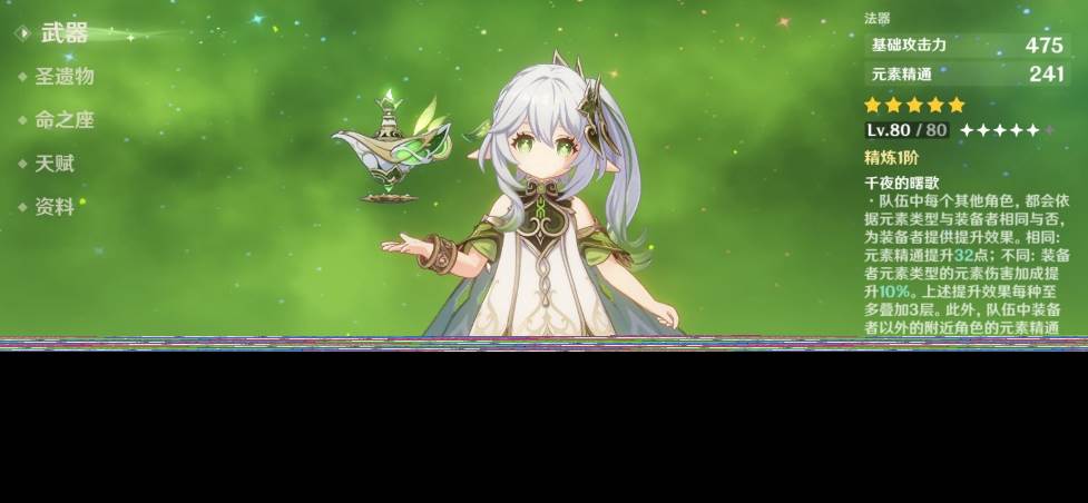 因此不仅梦见月瑞希能用,砂糖也能很好适配该武器,甚至能凭借它获得突破一千点的元素精通,将个人的增伤能力最大化。要注意的是当砂糖考虑循环时比起时之沙携带元素充能效率,祭礼残章的两次战技释放有更高性价比。纳西妲跟寝正月初晴的契合度也很高,在一定情况下契合度堪比千夜浮梦,如果异色队友满足三个,比如菲谢尔、行秋和久岐忍,千夜浮梦的特效会提供九十六点元素精通加成。