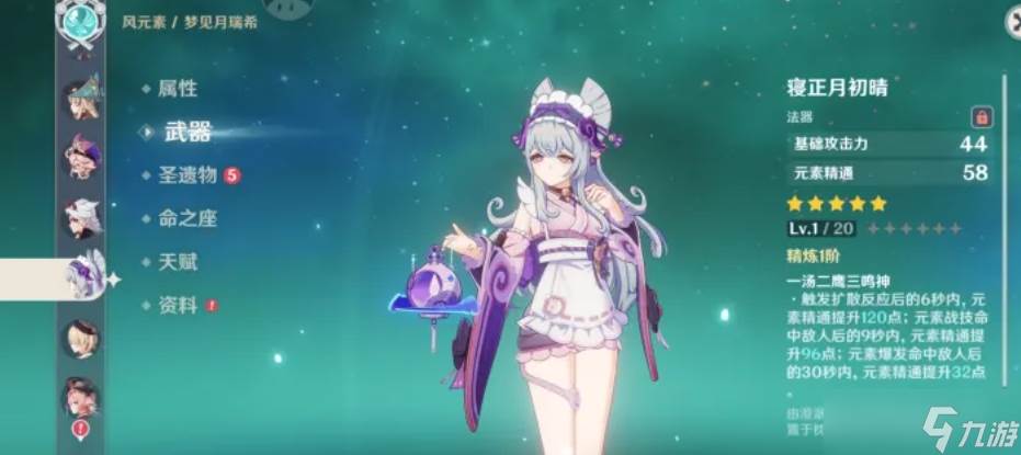 它的特效是触发扩散反应后的六秒钟时间内提升一百二十点元素精通,战技打中敌人后的九秒钟内提升九十多点元素精通。大招命中敌人后的三十秒内提高三十二点元素精通,这是一个对风系法器角色作用较大的特效,一般来说只有风元素角色能触发扩散反应。