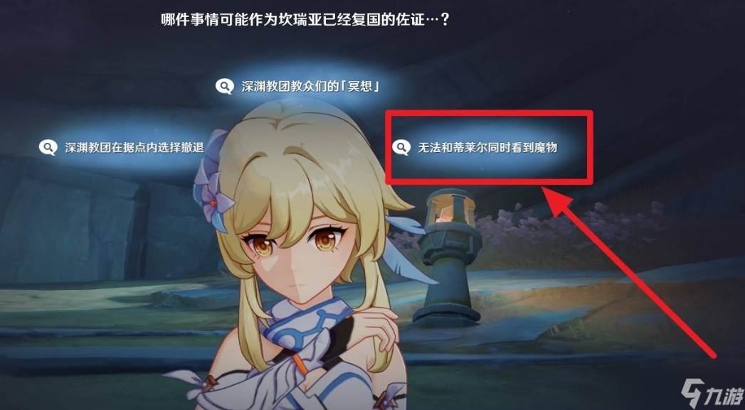 完成战斗后继续触发对话。之后开始反击,优先破坏掉紫色的底座。沿着任务指引一路前进到水边,击败深渊使徒后触发对话。选择正确的选项完成推理,正确选项为【无法和蒂莱尔同时看到魔物】,以佐证坎瑞亚已经复国。