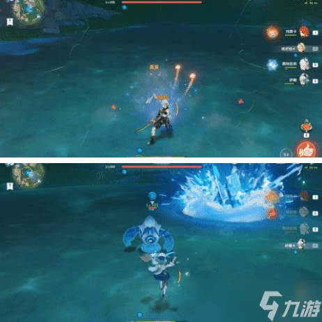 但此时,若队伍中的角色处于夜魂加持状态下一段时间后,BOSS就会进入进攻模式:抗性降低为50%,并会使用更强的“水柱”攻击,容易秒人。