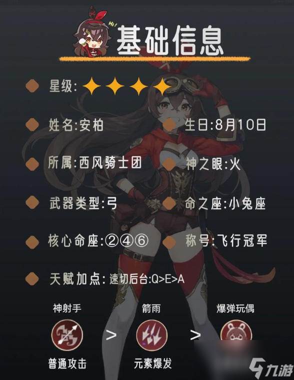 安柏是一名火属性远程弓箭角色,永远充满活力的女孩,热情似火,有着无尽的朝气与精力。她勇敢地面对困难,但有时也会因精力过剩而无意中制造一些小麻烦,虽然她在游戏中的定位较为多样,可作为侦察角色提供情报,但在战斗方面,更偏向于辅助和功能性角色。