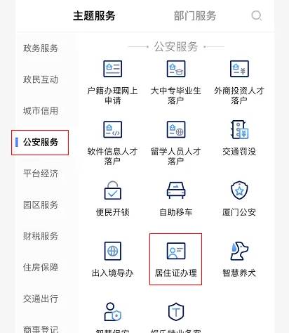 进入主题服务界面,点击公安服务-居住证办理进入。