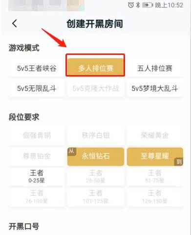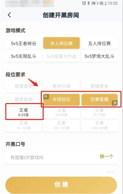 选择需要的开黑段位(排位赛目前只能选永恒钻石、至尊星耀、王者0~25星)