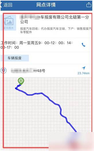 此时我们就能看到处理报废车辆的地址信息,点击 报废处理公司