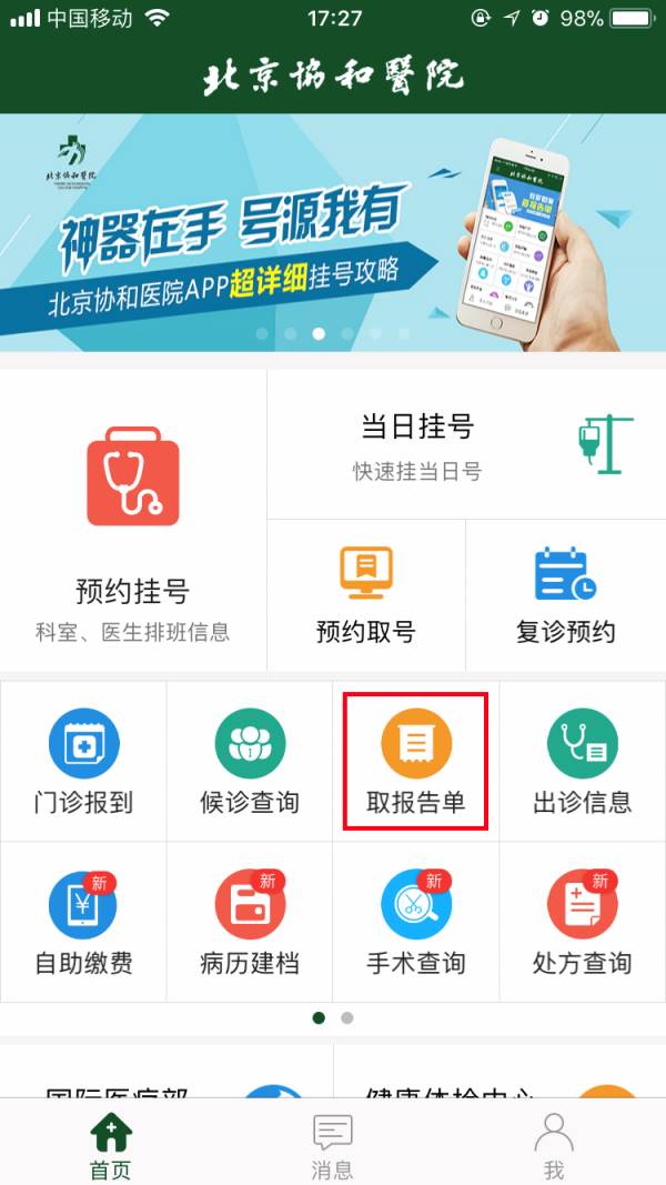 1、 在APP首页点击【取报告单】;