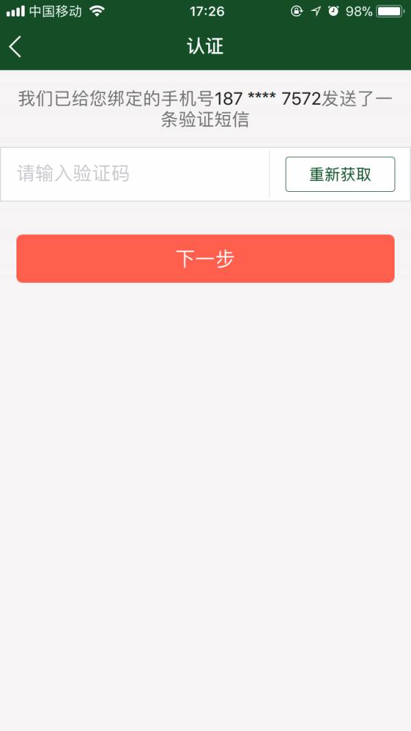 3、 输入验证码后,点击下一步完成认证;