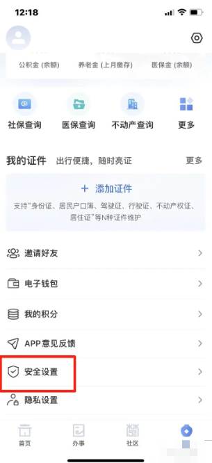 第二步:在我的页面点击【安全设置】。
