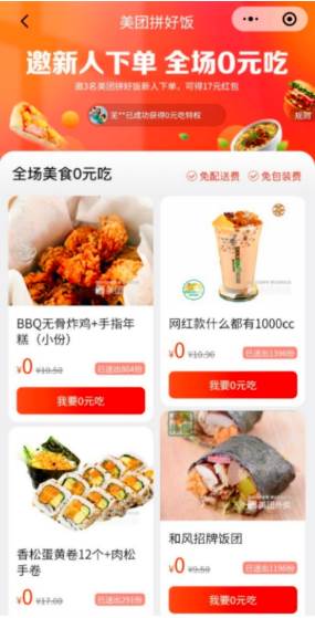 2、进入美团拼好饭页面,可以看到“拼好饭”针对新用户推出了全场0元吃的活动,邀请3名新人即可获得免单特权;
