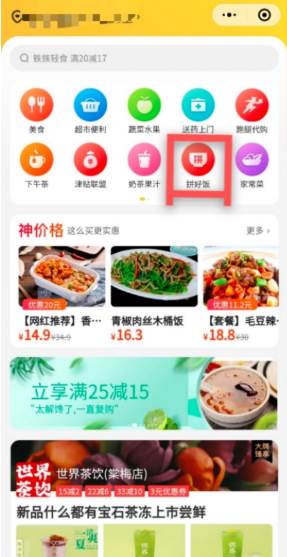1、打开美团外卖APP或微信小程序,在首页点击“拼好饭”;
