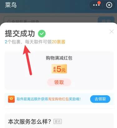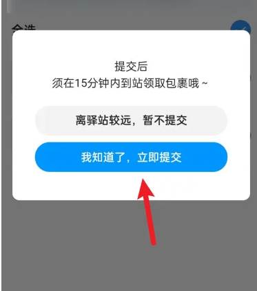 提交的时候,系统会提示必须15分钟内到驿站领取包裹,点击立即提交。