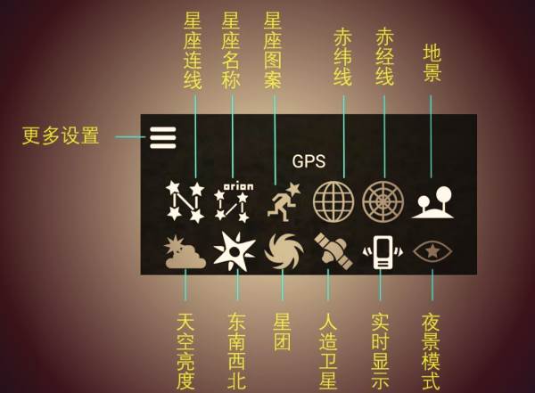 图2展示了详细设置界面,而图3则详细列出了各按钮的名称。在界面中,灰色通常表示该功能已关闭,而白色则表示功能已打开,并会在屏幕上显示相关内容。当处于“实时显示”模式时,只需将手机背面对准想要观察的天空区域,屏幕即可实时呈现该方向的星空。