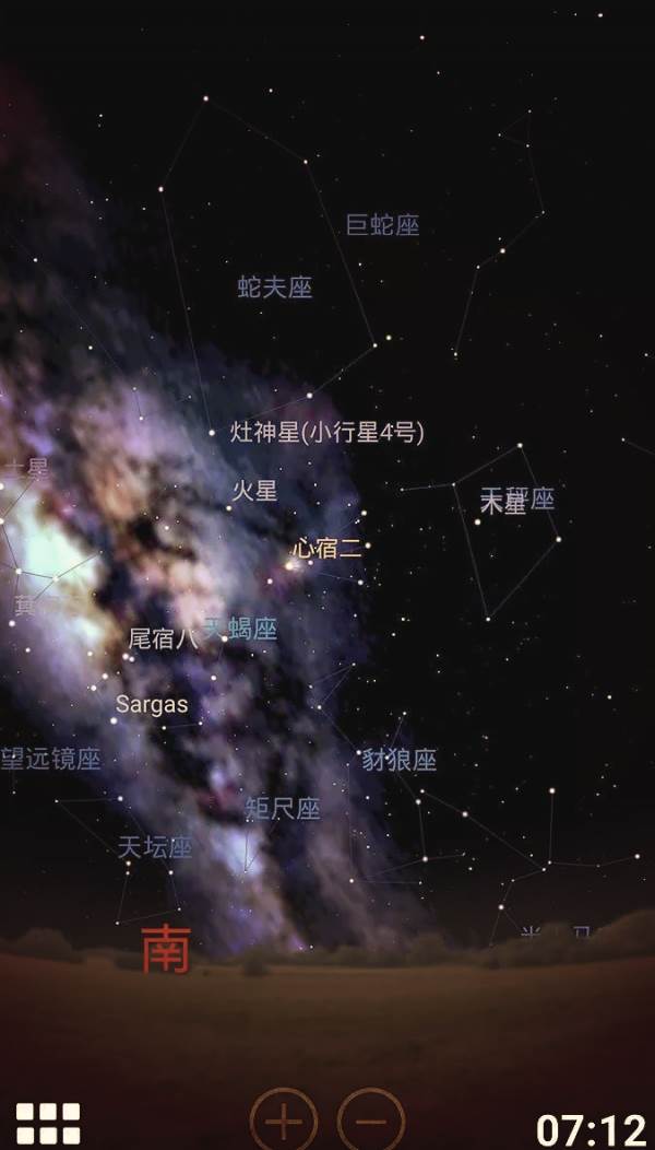 图1展示了启动Stellarium后的界面概览。在界面底部,一系列关键按钮从左至右依次排列:设置按钮、放大/缩小按钮以及实时显示当前时间的功能。借助这些按钮,用户可以轻松地操控界面,深入探索天空的奥秘。同时,通过在屏幕上流畅地滑动手指,天空与地景的移动和旋转变得轻而易举,为用户带来沉浸式的体验。