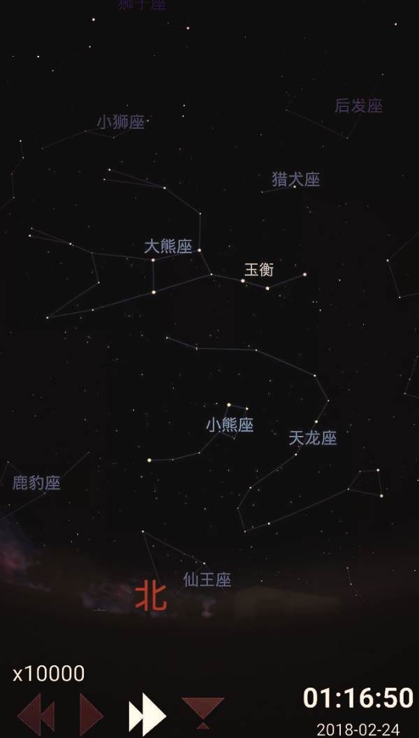 在图5中,你可以通过点击双箭头来“快进”或“快退”星空的变化,每次点击都会使速度增加10倍。例如,当你点击到第6次时,星空将以10000倍的速度播放。若此时你点击左2的箭头,播放速度将恢复为实时,但时间点会停留在你已经快速播放到的那个时刻。而如果你点击左4的箭头,播放将直接跳转回当前的实际时间。