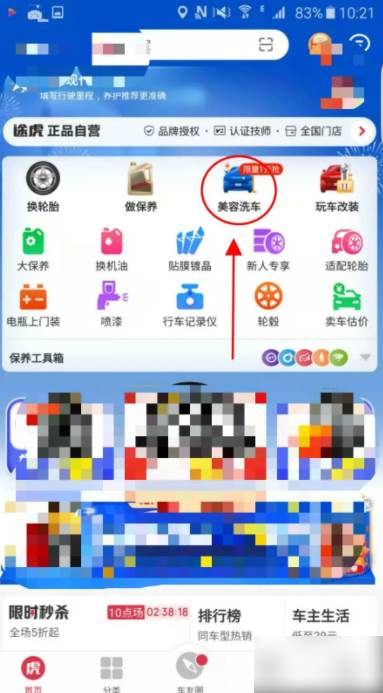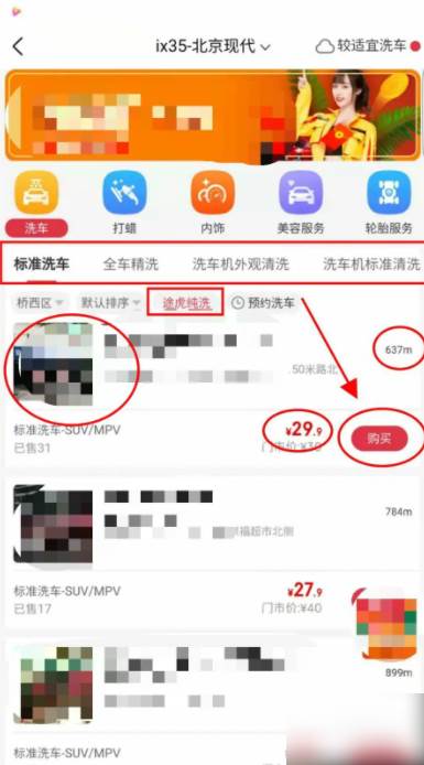 3、首先选择清洗类型,然后滑动屏幕选择洗车行,点击符合要求的洗车行(或者直接点击“购买”),如图