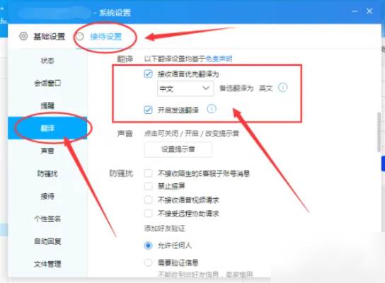 选择“接待设置”里面的“翻译”,根据你的需要,设置“开启发送翻译”和“接收语言预先翻译为”,一般设置为中文或者英文。如图所示