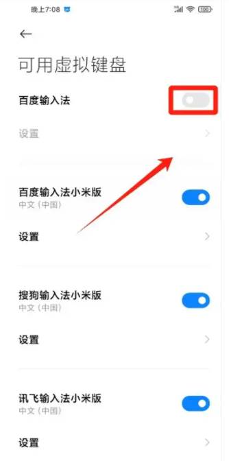 3、进入可用虚拟键盘界面,点击“百度输入法”右侧按钮开启。