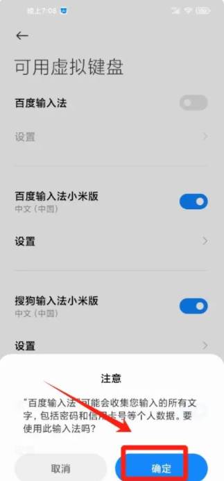 打开百度输入法app,点击“第一步勾选百度输入法”,进入可用虚拟键盘界面,点击“百度输入法”右侧按钮开启确定即可。