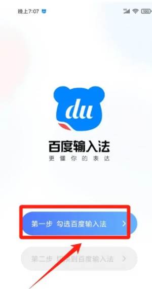 2、打开百度输入法后,点击“第一步勾选百度输入法”。