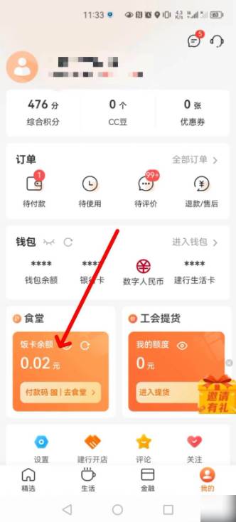 3.绑卡完成后在“我的”菜单页面点击“食堂”菜单
