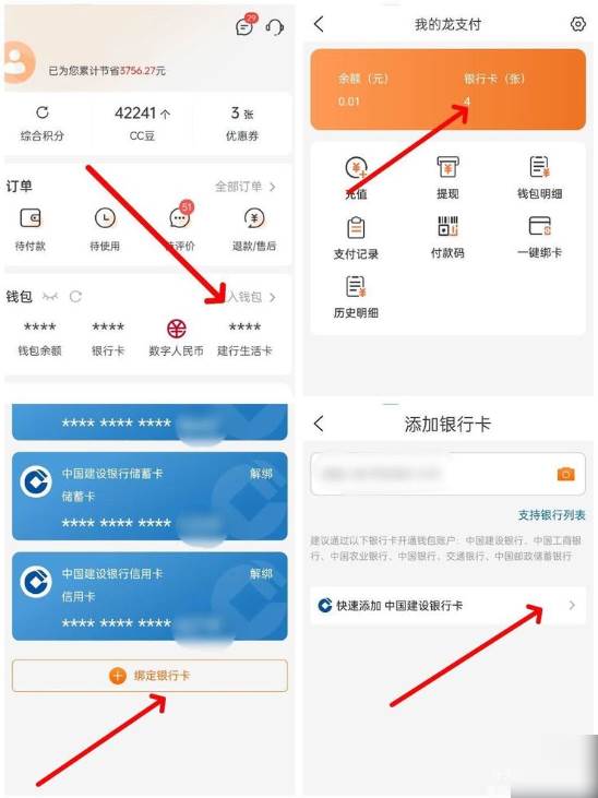 2.绑定银行卡。登录建行生活app,点击“我的”—“我的钱包”—“银行卡”—“绑定银行卡”—“添加银行卡”(可绑定各家银行卡)