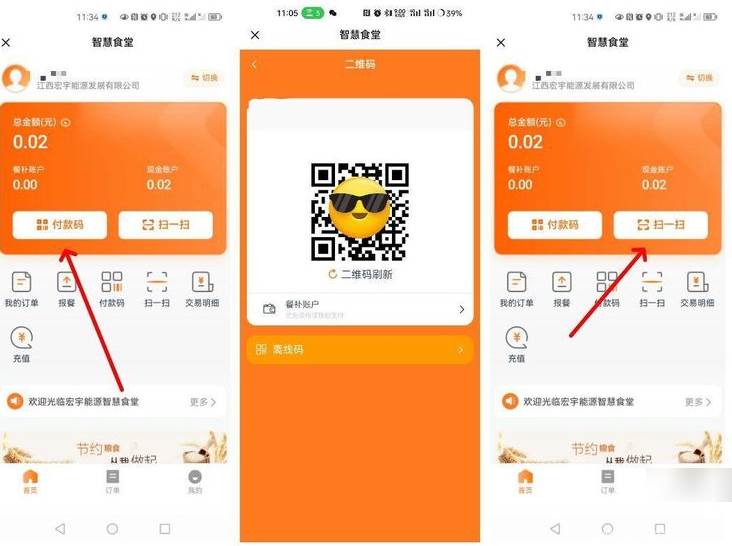 5.付款时在菜单中点击“付款码”,出示付款码付款;或点击旁边菜单“扫一扫”进行扫码支付。