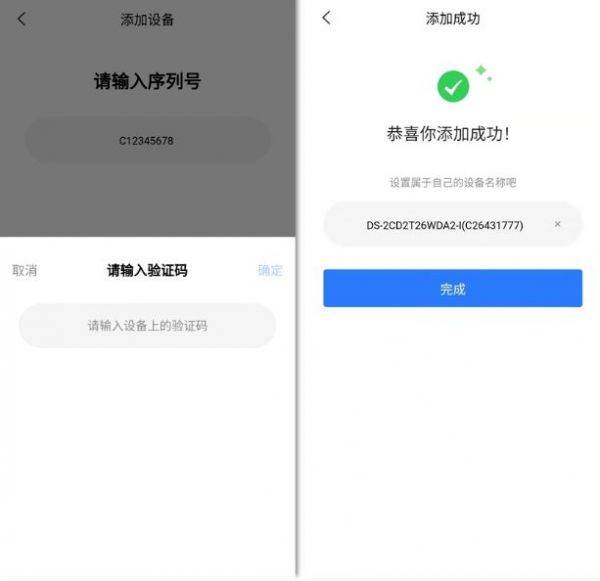 在APP首页点击“添加设备”,在扫描添加设备界面右上角点击“手动添加”输入设备序列号及验证码,即可成功添加设备并修改设备名称。