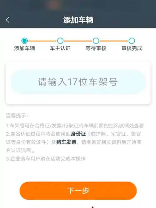 页面跳转后,我们输入17位车架号后,点击下方的“下一步”并根据页面提示进行后续操作即可,希望能有所帮助