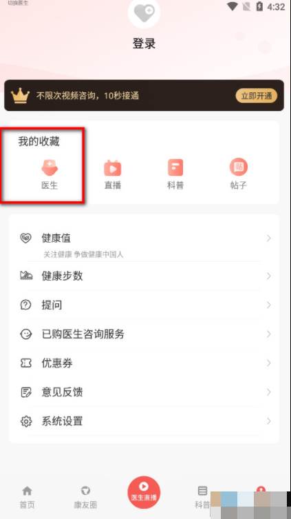 3、可以看到“我的收藏”栏目中,有一个医生的选项,这里我们点击它。
