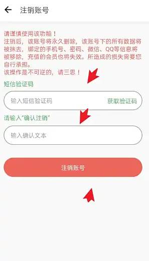 进入到注销账号界面,输入手机验证码,输入【确定注销】,点击注销账号即可。
