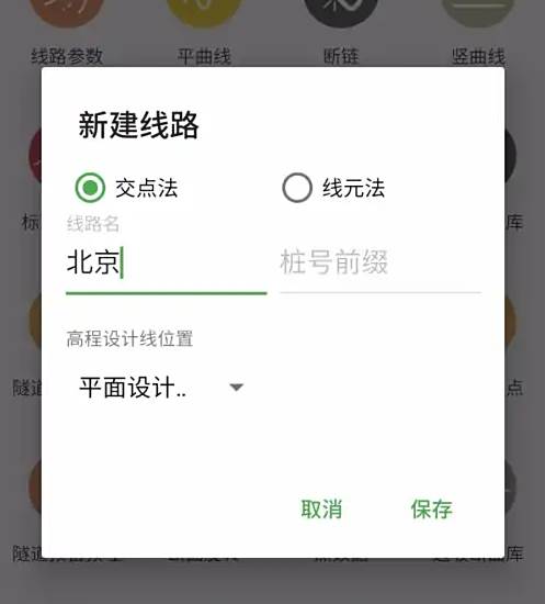 点击新建项目,就会弹出一个界面,在界面里面选择交点法,线路名字就是你要给你输入的交点法取个名,桩号前缀不填的话默认为K(就是K12+666这种样式的,如果需要换的话就在桩号前缀里输入需要的前缀),下面还有个高程设计线位置,这个我们不用动它。然后点击保存,这样我们线路就新建好了。