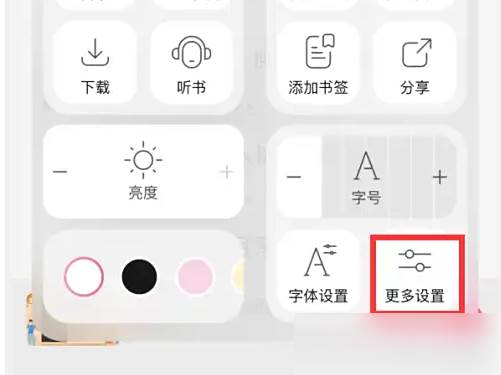 进入阅读页后,轻触屏幕中间,弹出窗口,点击“更多设置”。