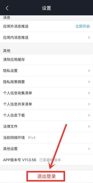 4、在设置页面底部点击【退出登录】,重新登录即可。