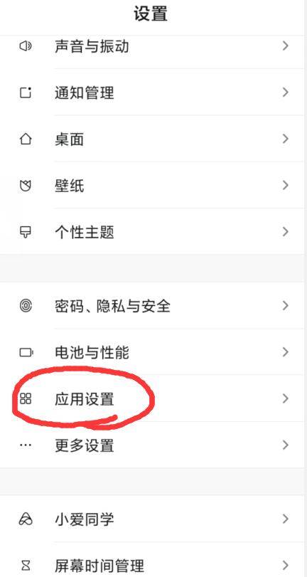 在下面的手机设置页面,找到应用设置按钮