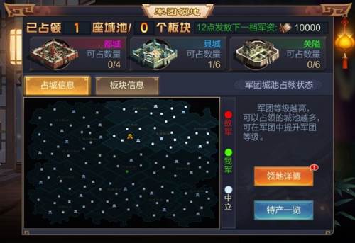 ⑺在军团领地中,可以清晰查阅当前军团所占领的方位以及城池数,军团随等级提升,可提升最大上限占领城池数。