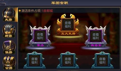 ⑼设有军团官职,至少占领1座都城可开启,共设有15个职位,每个职位都拥有官职奖励、收益加成等,随占领都城越多(1/3/6/10)解锁更高爵位,官职奖励也会随即提升。(除第1个官职固定是军团长担任外,其余官职都可以由团长、副团长自由分配)