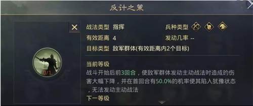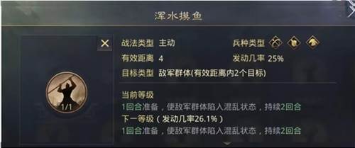 典藏战法【当阳桥】,1级时发动率为25%,满级时发动率为40%,有效距离4。