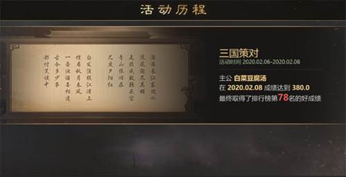 个人征程界面中将加入“活动历程”入口,点击可查看活动相关的历史记录。活动历程将记录主公参与过的,有排行榜排名记录的活动。