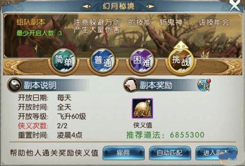 1、玩家已用尽副本次数,帮助未完成副本的玩家完成副本,每个副本额外有2次侠义值副本的次数。