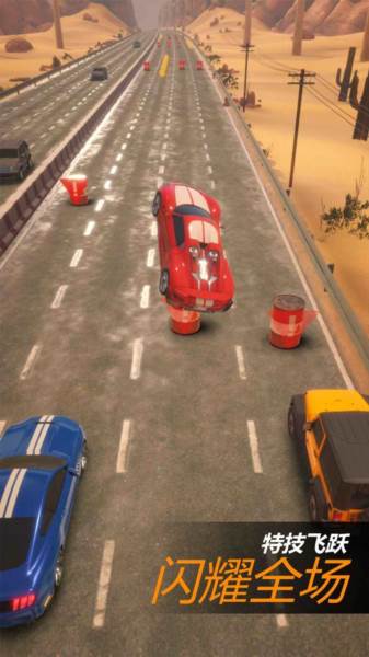 1、路面存在其他车辆、增益道具和金币,找到安全的区域中测试你的极限,挑战最高得分。