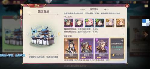 营地这里上场的都是你最强的武将。这里说一下,零氪党尽量先不要开这个训练位,因为前期不划算,前期元宝优先抽武将。当然如果是氪佬的话,这个优先开启,毕竟关系到pvp。