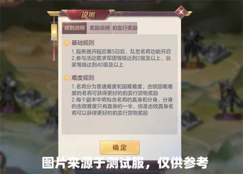 开启条件:开服第5日后,且军团等级到达2级,乱世名将玩法将会开启。届时,军团内40级以上的玩家可以参与该玩法。