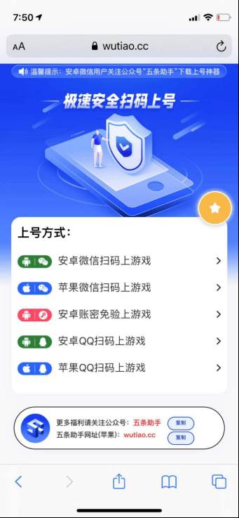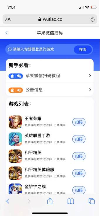 如果大家还需要王者安卓上号器、安卓微信扫码等其他4种上号办法,可以搜索关注五条助手公众号进行进一步了解。废话不多说,直接上教程。苹果QQ扫码登录通用流程:
