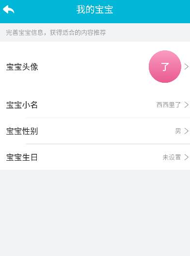 3、进入我的宝宝页面,这里可以修改宝宝名字,性别,生日,头像等信息。