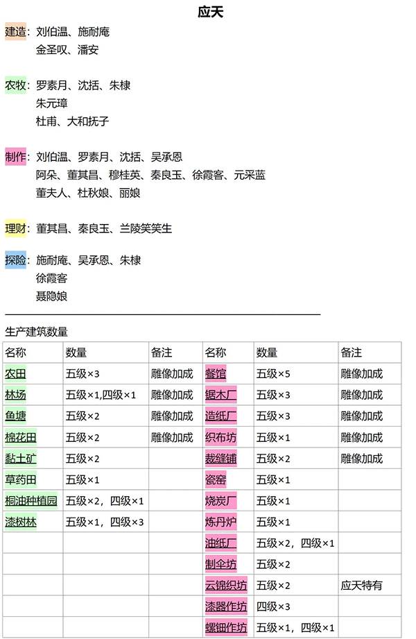 有雕像祝福的生产建筑,如农田、林场、鱼塘、棉花田、餐馆、锯木厂、造纸厂、织布坊、裁缝铺,这些都可以作为重点安排生产内容,基本上应天就是以生产资源为主的,所以我放的生产建筑也比较多。