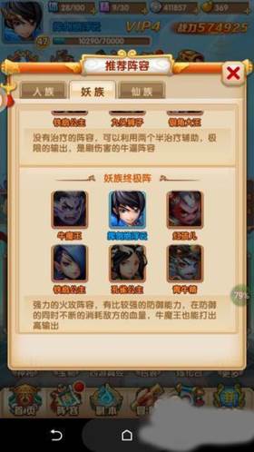阵容解析:这是人族的橙卡终极阵容,目前也是官方推荐阵容之一,最多 43 缘分,这个阵容的优势在于猪八戒和孙悟空都是120资质的神将,属性高攻击强,而且搭配小白龙的辅助防御和沙悟净的回怒效果,是一个稳定输出的综合能力很强的阵容。