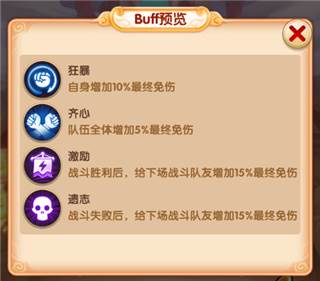 激励:战斗胜利后,给下场战斗队友增加15%最终免伤