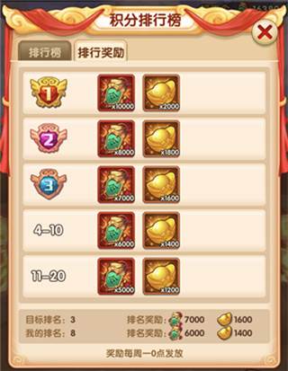 排行榜积分会在每周一0点重置,结算上周的排名奖励哦!