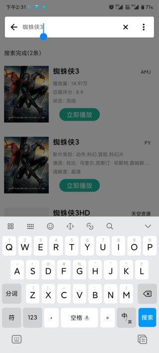 2、在搜索框内输入自己想要的资源,比如“蜘蛛侠3”